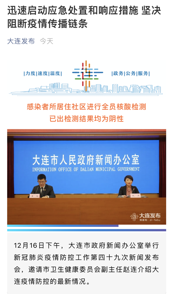 荔枝新闻讯 据“大连发布”微信号消息,12月16日下午,大连市政府新闻办公室举行新冠肺炎疫情防控工作第四十九次新闻发布会,邀请大连市卫生健康委员会副主任赵连介绍大连疫情防控的最新情况。