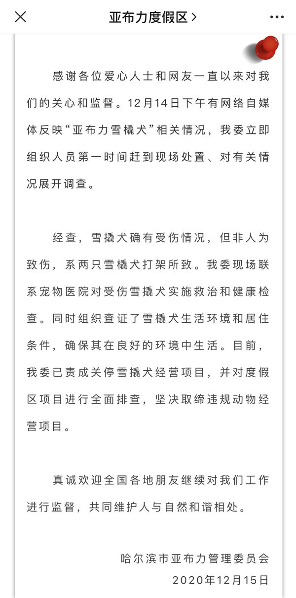荔枝新闻讯 针对网传“哈尔滨亚布力滑雪场雪橇犬疑遭虐待”一事,亚布力滑雪旅游度假区管委会12月15日通过微信公众号公告称,经查,雪撬犬确有受伤情况,但非人为致伤,系两只雪橇犬打架所致。目前,管委会已责成关停雪撬犬经营项目,并对度假区项目进行全面排查,坚决取缔违规动物经营项目。