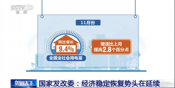 11月份,全国规模以上工业发电量同比增长6.8%,增速比上月提高2.2个百分点。同时,全国全社会用电量同比增长9.4%,增速比上月提高2.8个百分点。在投资项目审批方面,11月份,国家发展改革委共审批核准固定资产投资项目26个,总投资3704亿元,主要集中在交通、信息化和能源等领域。