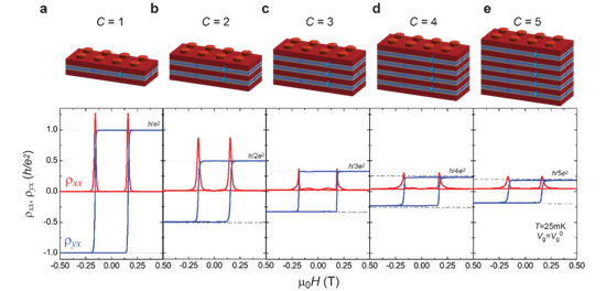图2:量子反常霍尔绝缘体中的陈数调控。通过(a)改变磁性掺杂的浓度或(b)中间磁性掺杂绝缘体的厚度实现量子反常霍尔绝缘体的陈数调控。(c)五层结构中非平庸表面态数目的变化。一对非平庸表面态贡献陈数为1。