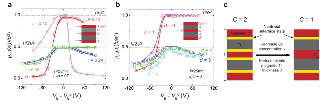 当掺杂浓度确定时,量子反常霍尔绝缘体的陈数还会受到非掺杂拓扑绝缘体(Bi, Sb)2Te3 层间相互作用的影响。距离越近,相互作用越强。只有当相邻的非掺杂拓扑绝缘体(Bi,Sb)2Te3层间相互作用小于一定临界值时,器件才会表现出高陈数量子反常霍尔效应。研究者们通过控制中间磁性掺杂拓扑绝缘体Crx(Bi,Sb)2-xTe3层的厚度同样实现了对量子反常霍尔绝缘体的陈数调控。实验发现,当磁性掺杂拓扑绝缘体Crx(Bi,Sb)2-xTe3层厚小于或等于1纳米时,器件表现出陈数为1的量子反常霍尔效应;大于或等于2纳米时,器件表现出陈数为2的量子反常霍尔效应(图2b)。