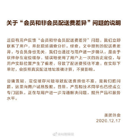 美团表示,在知晓该问题后,美团外卖立即联系了用户,并赴现场调查分析。经查,文中提到的配送费差异,与会员身份无关,通过与用户进一步确认,发现是由于软件存在定位缓存,错误地使用了用户上一次的历史定位,与用户实际位置产生了偏差,导致了配送费预估不准。