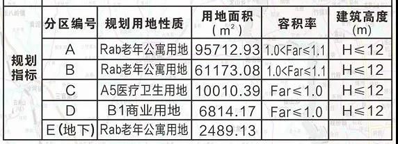 首期地块片区计划打造CCRC全生命周期中高端森林康养社区,将为老年人提供自理、介护、介助一体化的居住设施和配套服务,集居住、护理、休闲配套于一体。其中:A、B分区将建设环境优美静谧、生活舒适宜人的康养住宅社区,可上市销售、转让。C分区将配建一所不少于200张床位的老年护理医院。D分区内将配建社区日间照料中心、老年社区服务中心、老年社区文化艺术中心、社区食堂、社区居家养老服务用房等。E分区为出让地下空间,地面为城市道路,可建设停车设施。