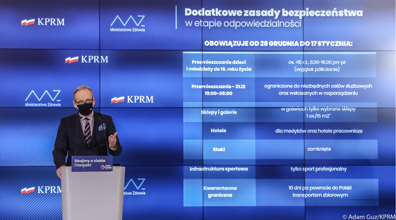 当天,涅杰尔斯基在新闻发布会上宣布,在实行全民隔离期间将加强部分防疫措施,包括:新年夜实施宵禁,即2020年12月31日晚19时至2021年1月1日凌晨6时,除必要的公务出行和规定的其他例外情况,禁止民众外出;再一次关闭商场,仅允许保障基本生活用品的商店、药店等营业;进一步限制酒店营业,禁止接待之前允许的商务旅客,但仍可对军警、医务人员等开放;关闭滑雪场;通过有组织运输进入波兰的人员需进行10天隔离。