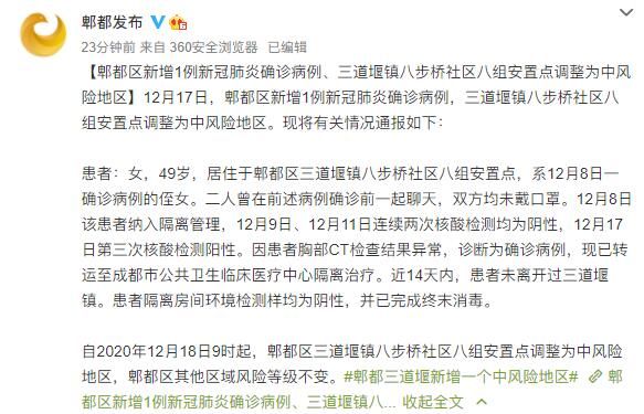 荔枝新闻讯 12月17日,郫都区新增1例新冠肺炎确诊病例,三道堰镇八步桥社区八组安置点调整为中风险地区。现将有关情况通报如下: