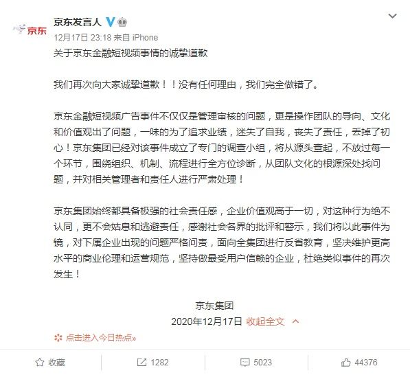 荔枝新闻讯 12月17日,京东发言人微博发布关于京东金融短视频事情的道歉。全文如下:
