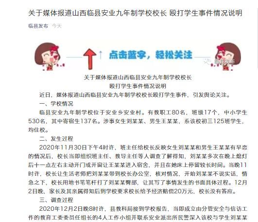 荔枝新闻讯 据“临县发布”微信公众号消息,近日,媒体报道山西临县安业九年制学校校长殴打学生事件,引发舆论关注。