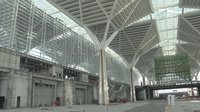 国家会展中心总建筑面积134万平方米,是中国北方最大的国家级会展项目。一期展览区和综合配套区为80万平方米,目前展馆屋面及外檐全部完成,正在机电安装施工阶段。其中3号样板馆,已基本建成。中央大厅采取伞柱结构,让空间利用率更高,视野更加开阔。同时屋顶的太阳能光伏板、雨水虹吸系统、立面隔音保温棉等设计,突出绿色环保理念。除了场馆部分,综合配套区一栋写字楼、一座酒店已经封顶。春节前,国家会展中心(天津)项目二期主体钢结构也将完成建设。
