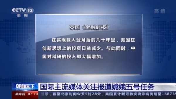 英国《金融时报》刊登题为《往返月球,中国研发正超越美国》的报道。文章指出,在实现载人登月后的几十年里,美国在创新思想上的投资日益减少。与此同时“中国对科研的投入却大幅增加。事实上,美国国家科学基金会的一名官员在新闻发布会上评论说,2019年的初步数据表明,目前中国的研发支出总额已超过美国。