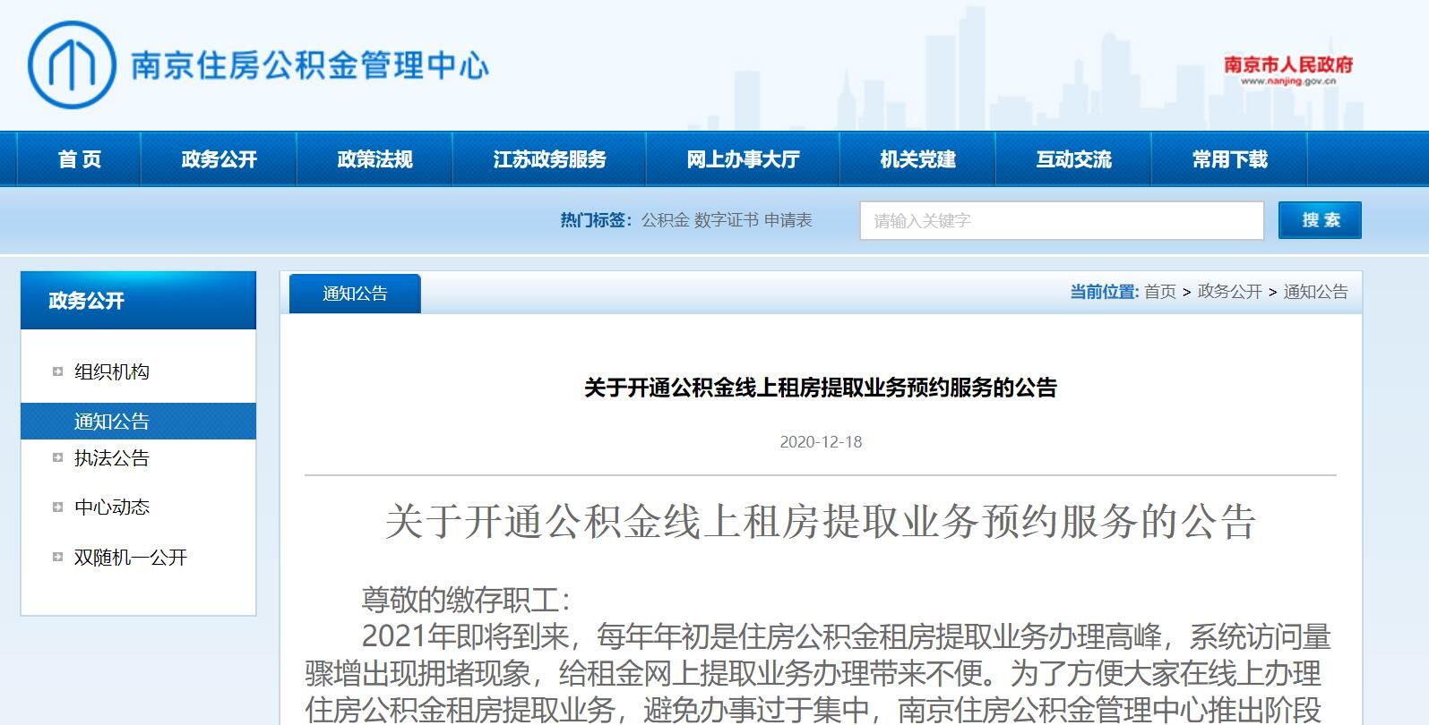 我苏网讯 12月18日,南京住房公积金管理中心发布关于开通公积金线上租房提取业务预约服务的公告。