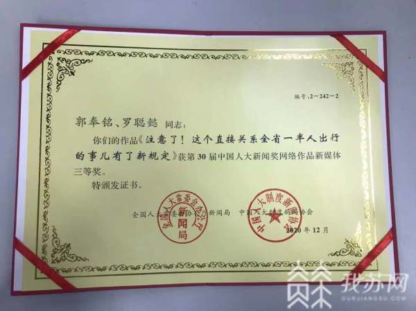 此外,“江苏新闻”微信公众号发布的新媒体短视频报道《直通北京·随团日记》,“评新而论”微信公众号发布的新媒体作品《厉害了!这个直接关系全省一半人出行的事儿有了新规定》,江苏新闻广播播发的报道《年初票决、年中跟踪、年底打分,建邺区民生实事项目票决制实现“闭环”》等3部作品获江苏人大新闻奖二等奖。