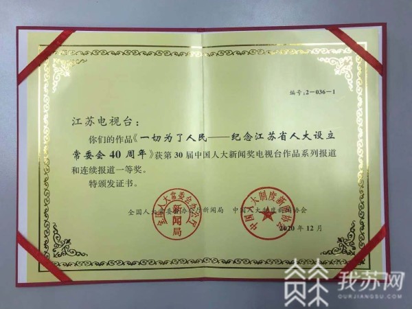 其中,由江苏广电融媒体新闻中心一部制作的《一切为了人民——纪念江苏省人大设立常委会40周年》系列报道获得中国人大新闻奖一等奖。该作品被评价为:生动展现了省人大设立常委会以来为人民履职,为人民服务,对人民负责的生动实践。