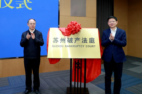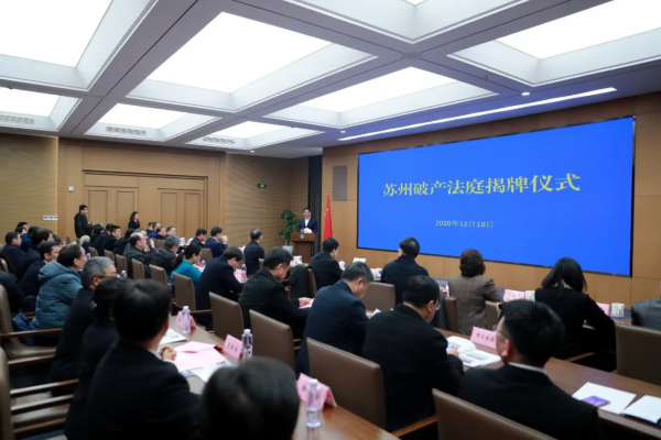 12月18日,苏州破产法庭正式成立。省法院党组书记、院长夏道虎,苏州市委副书记、市长李亚平为苏州破产法庭揭牌。苏州市委常委、政法委书记徐美健主持揭牌仪式,部分全国和省市人大代表、政协委员,省法院相关部门负责人,上海破产法庭、南京破产法庭负责人,市检察院、发改委、工信局、公安局、民政局、司法局、财政局、人社局等22家市企业破产处置协调联动机制各成员单位有关负责同志,苏州大学相关领域专家学者、市破产管理人协会负责人参加揭牌仪式。