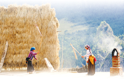甘肃迭部县扎尕那村村民在打青稞。