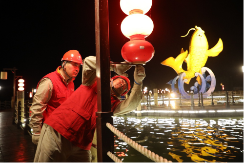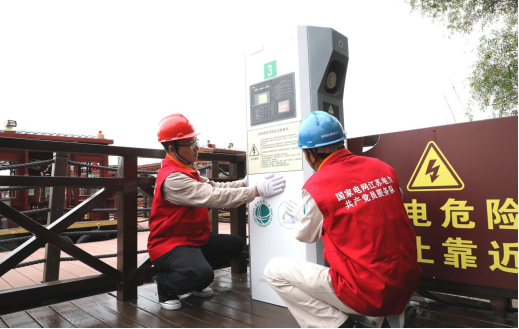供电员工在潮河湾景区内安装一体化码头岸电充电桩