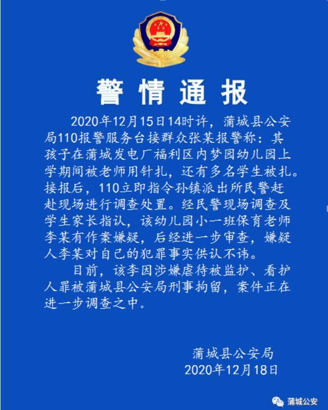 荔枝新闻讯 12月18日下午4点,蒲城公安微信公众号发布一则警情通报。2020年12月15日14时,蒲城县公安局110报警服务台接群众张某报警称:其孩子在蒲城发电厂福利区内梦园幼儿园上学期间被老师用针扎,还有多名学生被扎。经民警现场调查及学生家长指认,该幼儿园小一班保育老师李某有作案嫌疑。目前,该李因涉嫌虐待被监护、看护人罪被蒲城县公安局刑事拘留。以下为通报详情