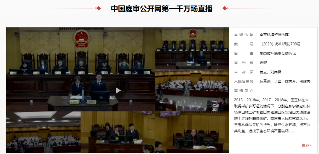12月4日,第七个国家宪法日当天,南京环境资源法庭公开审理一起非法采矿民事公益诉讼案。这是全国法院第1000万场庭审直播案件。