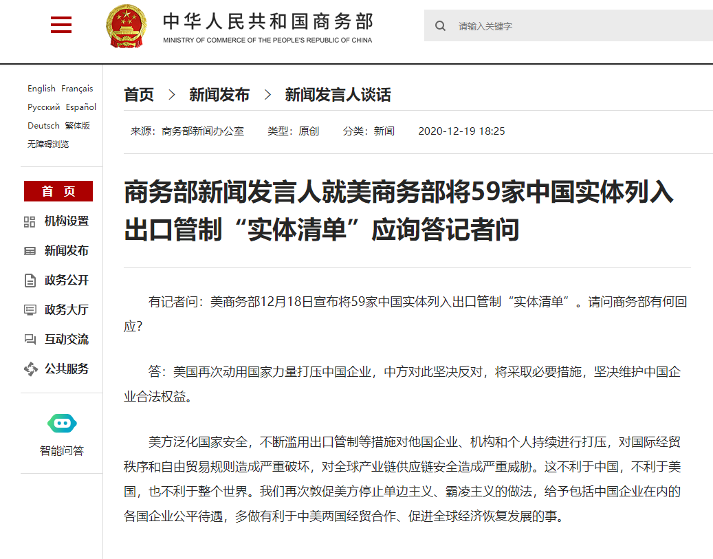 有记者问:美商务部12月18日宣布将59家中国实体列入出口管制“实体清单”。请问商务部有何回应?