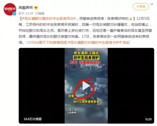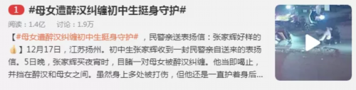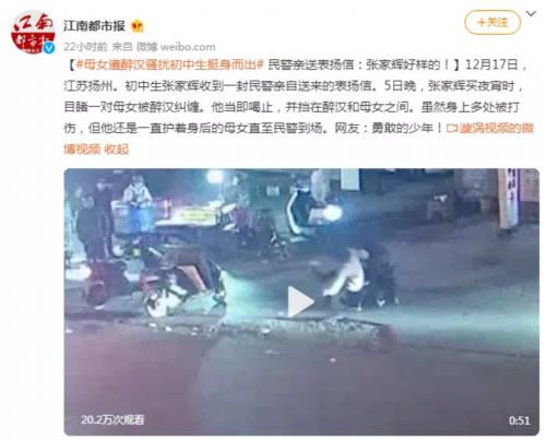 微博话题#母女遭醉汉纠缠初中生挺身守护#