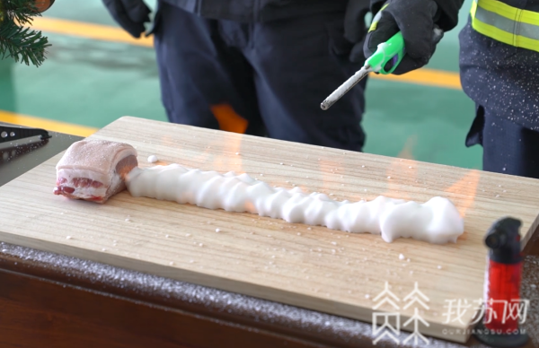 实验现场用带皮的猪肉模拟人的皮肤组织,将能喷出彩带的另一款“喷雪”喷到猪皮上,当消防员将“喷雪”点燃后,猪皮开始灼烧并发出兹拉的声响,整个过程持续了约1分钟。当“喷雪”清除后,部分猪皮已经被烧焦。