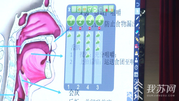 来自康复科学学院的宋秀丽老师带来了一堂生动的《吞咽生理过程》。在她看来,传统教学的互动模式是有限的,每节课只能考察到部分学生的学习情况。智慧教学能够了解到全班的学习情况,节省时间,而且高效。实操课、练习课、复习课也特别适合使用智慧黑板进行教学。