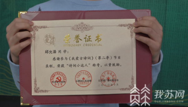 由江苏省文明办、共青团江苏省委、江苏省广播电视总台联合推出,江苏省教育厅、江苏省生态环境厅支持的大型青少年传统文化益智节目《我爱古诗词》第二季已经圆满收官,但依然持续引发关注,大家还在津津乐道谈论节目,学习古诗词的热情不断高涨。上周六,64名进入《我爱古诗词》演播室环节的“诗词小达人”中,已经有15位小选手率先拿到了“诗词小达人”证书。今天,又有5位小选手来到现场领取了证书。