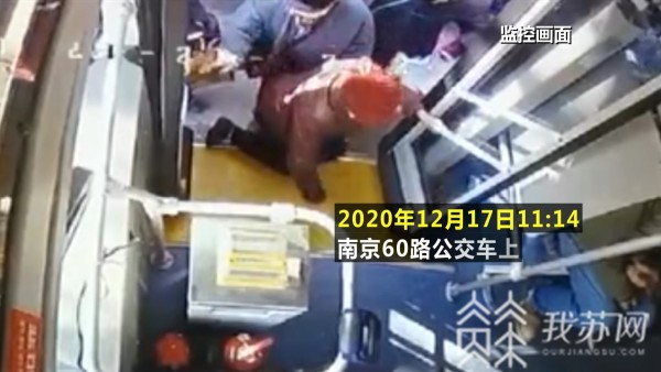 12月17日中午11:14,一名老人在上南京60路公交车时,因为台阶太高,直接跪在了台阶上。