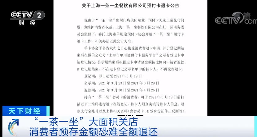 日前,知名连锁餐厅“一茶一坐”在其官方账号上发布了一则预付卡退卡公告,称由于门店关闭歇业,持有储值卡的消费者可以通过线上申请退款。根据网络上的加盟招商信息,“一茶一坐”在全国共有门店超过200家。目前门店经营状况如何,消费者是否能退回储值金?