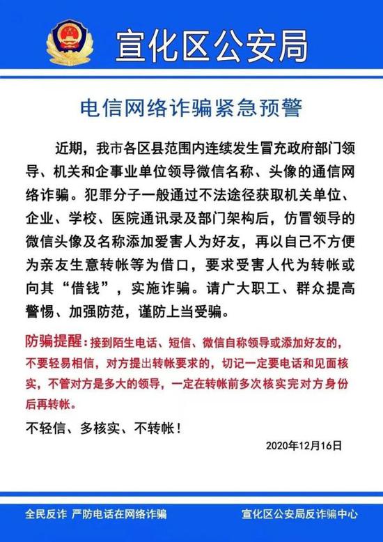 近日,张家口市多县发生以冒充县领导、乡镇领导进行诈骗的犯罪活动,诈骗分子通过网络搜索辖区公司、企业及其他相关经营单位法人、负责人电话,添加微信,并以借款给他人要求代为转账为由实施诈骗。