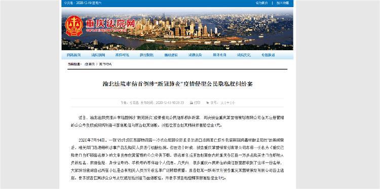 记者从重庆法院网了解到,近日,重庆市渝北区人民法院受理并审结一起涉“新冠肺炎”疫情侵犯公民隐私权纠纷案。