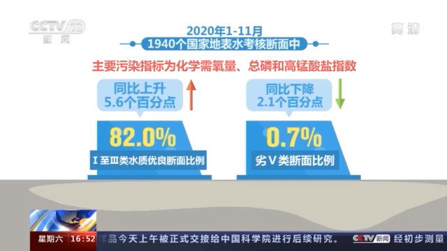 地表水方面,1至11月,1940个国家地表水考核断面中,Ⅰ至Ⅲ类水质优良断面比例为82.0%,同比上升5.6个百分点;劣Ⅴ类断面比例为0.7%,同比下降2.1个百分点。主要污染指标为化学需氧量、总磷和高锰酸盐指数。