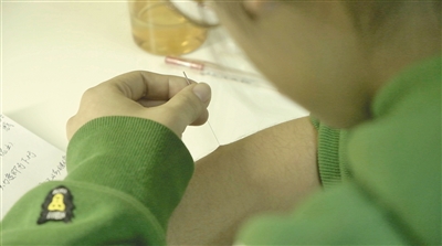“她好像在扎针。”自习室里,一位盘扎着长发,穿着绿色卫衣的姑娘引起记者的关注。只见这位姑娘背挺直,撸起衣袖,拿针对着自己的手臂在扎……