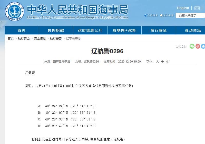 据中国海事局网站消息,葫芦岛海事局发布航行警告,12月21日12时至18时,渤海部分海域执行军事任务。任何船只在此时段不得进入相关海域。