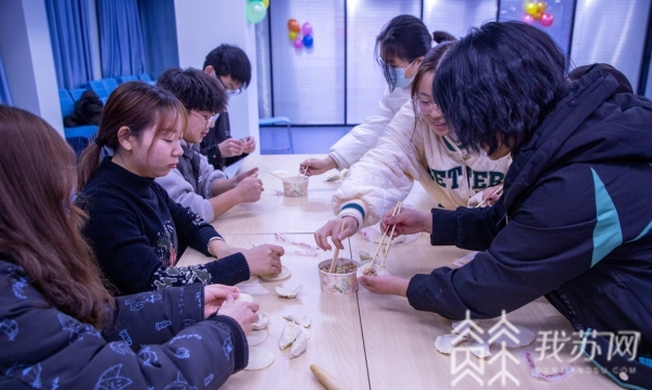 活动现场,同学们和贫困生们一起撸起袖子开始了紧张有序的包饺子大赛,有的剁陷的、有的和面、有的擀皮、有的包饺子,忙得不亦乐乎,无意间擦在脸上的面粉悄悄地愉悦着同学们炽热的心。比赛过后,同学们用包好的饺子摆成“冬至”字样,祈福新的一年有新的收获。团团圆圆包水饺,甜甜蜜蜜思乡情。大家还将快乐分享给远在家乡的亲人,在视频通话中传递冬至的温暖,一句“我想您了”再一次将大家带入感动的瞬间,他们的孝心、爱心、善心在这个冬天“火”了起来,让人热泪盈眶。