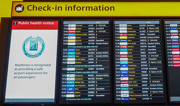 当地时间2020年12月21日,英国伦敦,希思罗机场显示多国航班已被取消。人民视觉 图