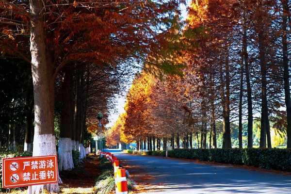 钱资湖公园北岸的杉林也达到了最佳观赏期,绣红色的杉树林在阳光的照射下将公园景色妆扮得光彩夺目。
