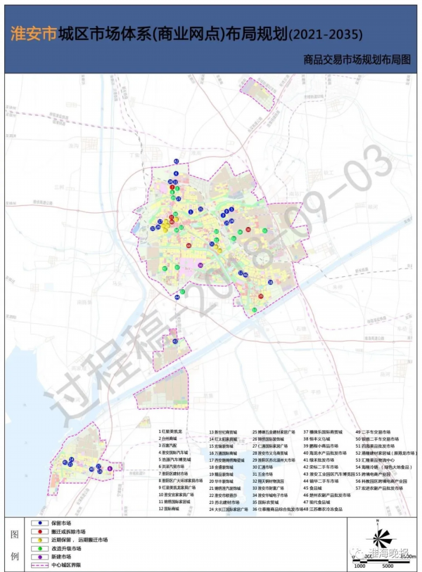 到规划期末2035年,淮安中心城区有各类商品交易市场53个(搬迁4个,不包括农贸市场)。