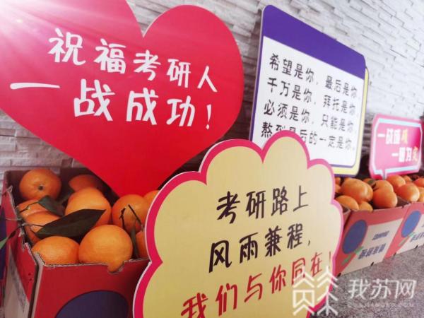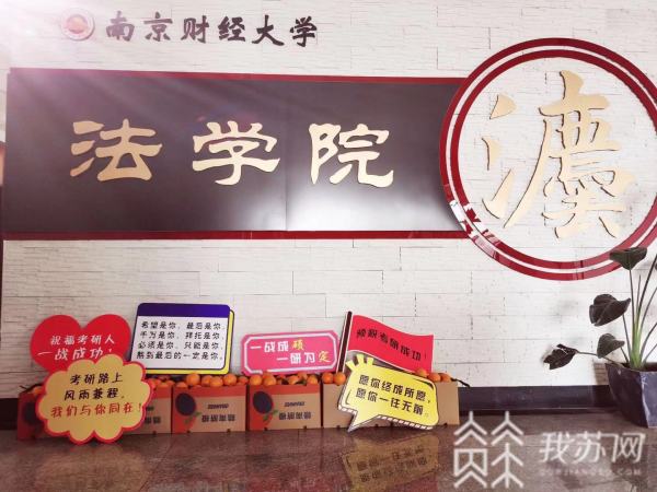 南京财经大学法学院师生热心为考研同学准备了水果脐橙,并细心制作“一战成硕,一研为定”、“愿你终成所愿,愿你一往无前”等祝福语。这些热情洋溢的祝福让17级考研人倍感鼓舞。