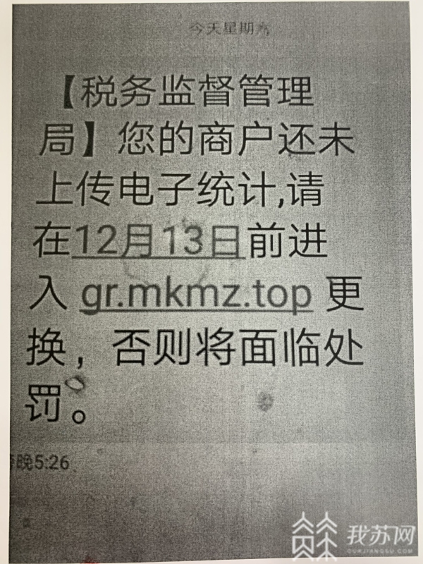 据齐先生介绍,当天下午自己在家上网,手机突然收到了一条税务监管部门发来的短信,内容显示齐先生的商户还未上传电子系统,请齐先生在12月13日之前尽快上传,否则将面临处罚,里面还附着一条链接。齐先生的确开了一家店铺,他看到规定的截止日期还有一天时间,便想都没想赶紧按照上面的内容进行了上传。