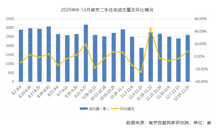 官方网站南京网上房地产显示,上周(12月13日-12月20日)全市共成交二手房2618套,比前一周的2418套多卖了200套,涨幅为8.3%。扬子晚报/紫牛新闻记者从近几周的交易数据上发现,这是南京自11月中旬以来,二手房单周交易量的首次环比上涨。由于受到新房大量入市以及年终交易淡季的影响,南京二手房市场已经连续3周出现了环比下跌的行情,本次上涨是否意味着二手市场进入上升通道?业内人士认为,从今年10月份以来的数据上看,南京二手交易量整体平稳,2618套的数量基本上维持过去数周的平均水平,尤其是临近年关,二手市场难有较大涨幅。