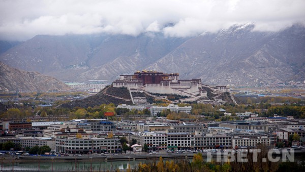 图为秋冬交替、雨雪更迭,布达拉宫迎来了一年一度的粉刷“换装季”
