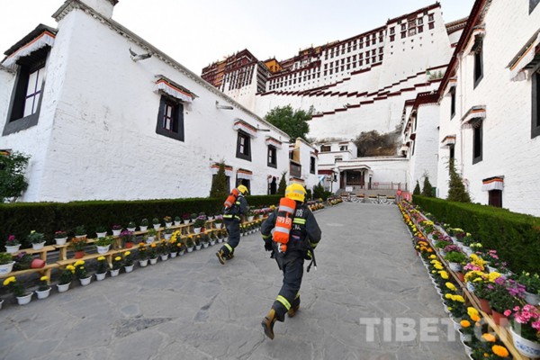 图为布达拉宫消防救援大队在开展消防救援实战演练