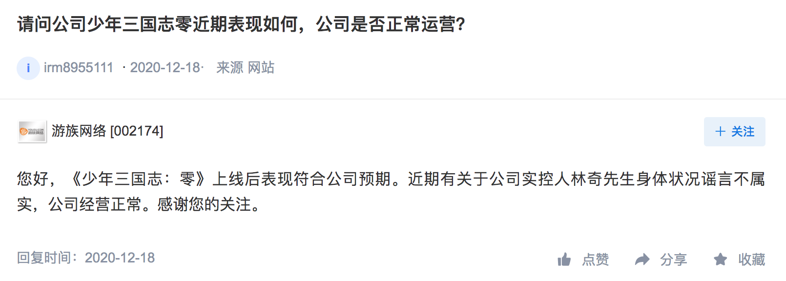 深交所互动易显示,12月18日,游族网络在回答投资者提问时表示,有关于公司实控人林奇先生身体状况谣言不属实,公司经营正常。