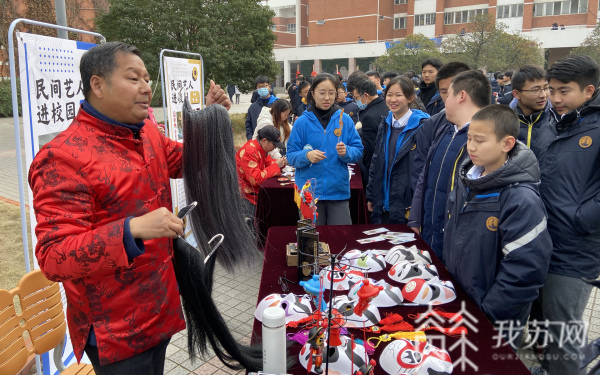 最近,南京外国语学校仙林分校正举办一年一度的校园艺术节,各种艺术展示活动精彩纷呈。12月23日中午时分,十几位民间艺人在学校食堂外广场上支起小摊,活灵活现的泥人,五颜六色的彩灯,稀奇古怪的脸谱、古朴方正的印章……这场"非遗进校园"活动,邀请多位民间艺人为学生们作展示。