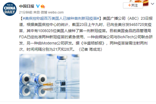 美国广播公司(ABC)23日报道,根据美国疾控中心的统计,截至23日上午九时,已向全美分发9465725支疫苗,其中有1008025位美国人接种了第一剂新冠疫苗。目前美国食品药品管理局FDA已经批准两种新冠疫苗的紧急使用,一种由辉瑞公司与BioNTech公司联合研发,另一种由Moderna公司研发。据《华盛顿邮报》,两种疫苗皆需注射两剂次,时间间隔分别为21天和28天。