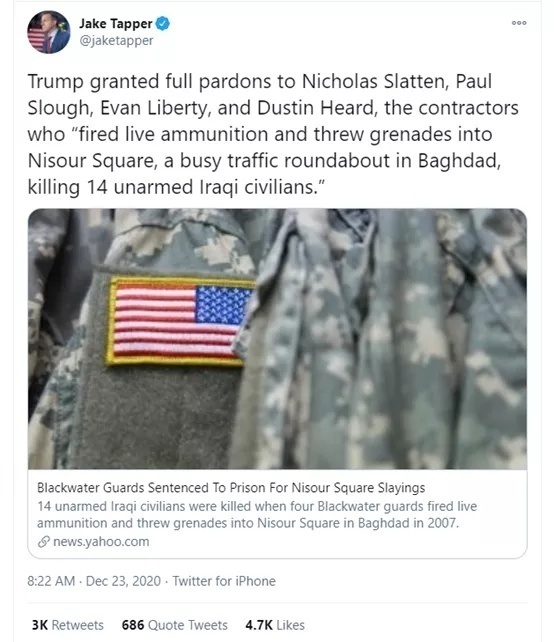 这其中最让人吃惊的是,有4名被特朗普特赦的囚犯,竟曾在伊拉克街头屠杀过10多名无辜平民。