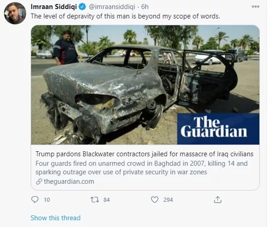 所以,当如今美国总统特朗普动用他的总统权力,将这4名屠杀了10多名无辜伊拉克人的凶手全部特赦后,立刻就震惊了本以为正义已经得到“伸张”的国际舆论。在境外的社交网络“推特”上,包括不少美国人在内的大量网民就在围观和怒斥特朗普这一毫无人性的做法。有人还认为应该废除这种违背法治精神的总统特权。