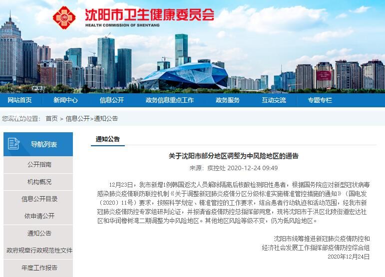 荔枝新闻讯 据沈阳市卫健委消息,12月23日,沈阳市新增1例韩国返沈人员解除隔离后核酸检测阳性患者,根据国务院应对新型冠状病毒感染肺炎疫情联防联控机制《关于调整新冠肺炎疫情分区分级标准实施精准管控措施的通知》(国电发〔2020〕11号)要求,按照科学划定、精准管控的工作要求,结合患者行动轨迹和活动范围,经沈阳市新冠肺炎疫情防控专家组研判论证,并报请省疫情防控总指挥部同意,现将沈阳市于洪区北陵街道宏达社区和华润橡树湾二期调整为中风险地区。其他地区风险等级不变,仍为低风险地区。