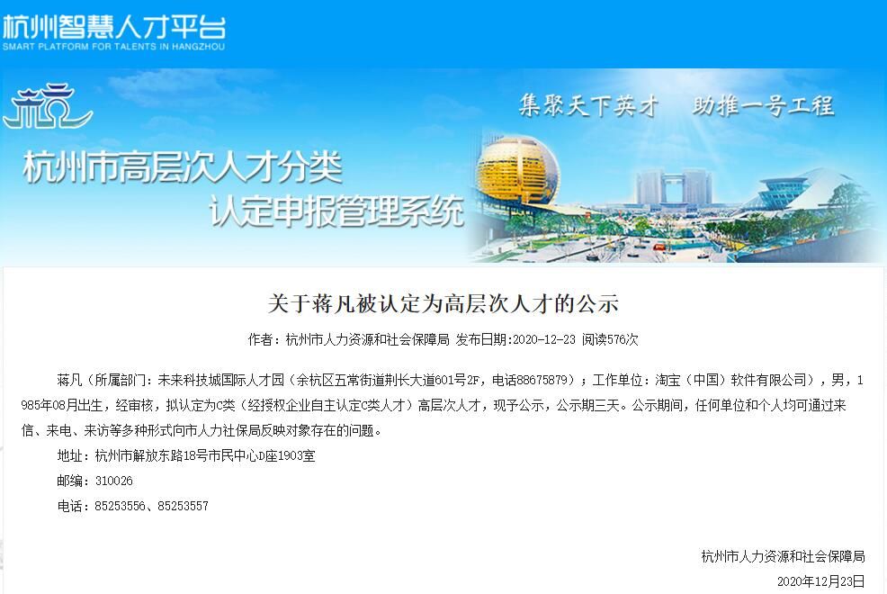 荔枝新闻讯 据杭州市人力资源和社会保障局消息,蒋凡(所属部门:未来科技城国际人才园(余杭区五常街道荆长大道601号2F,电话88675879);工作单位:淘宝(中国)软件有限公司),男,1985年08月出生,经审核,拟认定为C类(经授权企业自主认定C类人才)高层次人才,现予公示,公示期三天。公示期间,任何单位和个人均可通过来信、来电、来访等多种形式向市人力社保局反映对象存在的问题。
