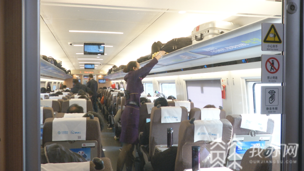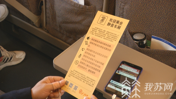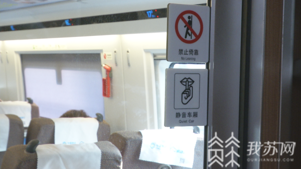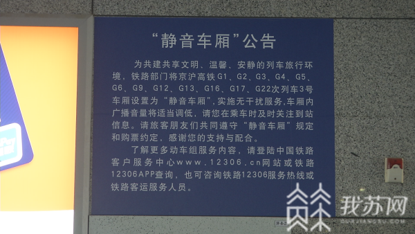 今天(12月24号)起,铁路部门在京沪高铁、成渝高铁上正式试点推出"静音车厢",其中京沪高铁线首批共有12趟列车开展"静音车厢"服务,它们都会在南京南站停靠,我苏网记者就登上了其中一趟列车,现场感受这段特别的旅程。